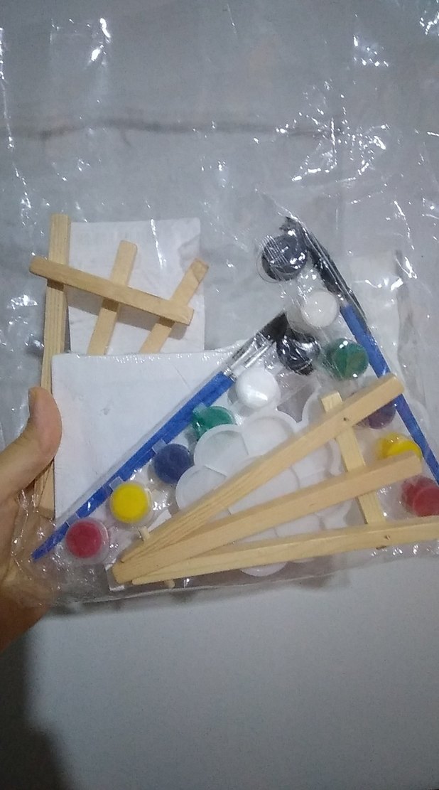 Ahşap ayaklar, çeşitli renkli boyalar, fırçalar ve paletler içeren boyama seti.