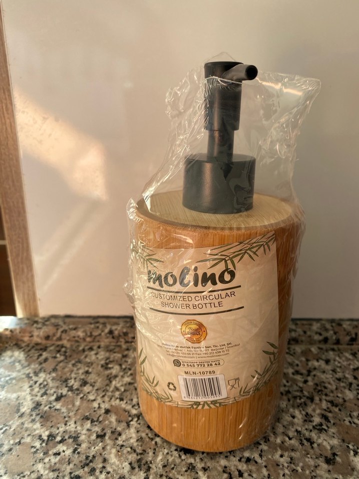 Ahşap bambu sabunluk yüzeye sahip, siyah pompalı Koruyucu plastik ambalaj içinde.