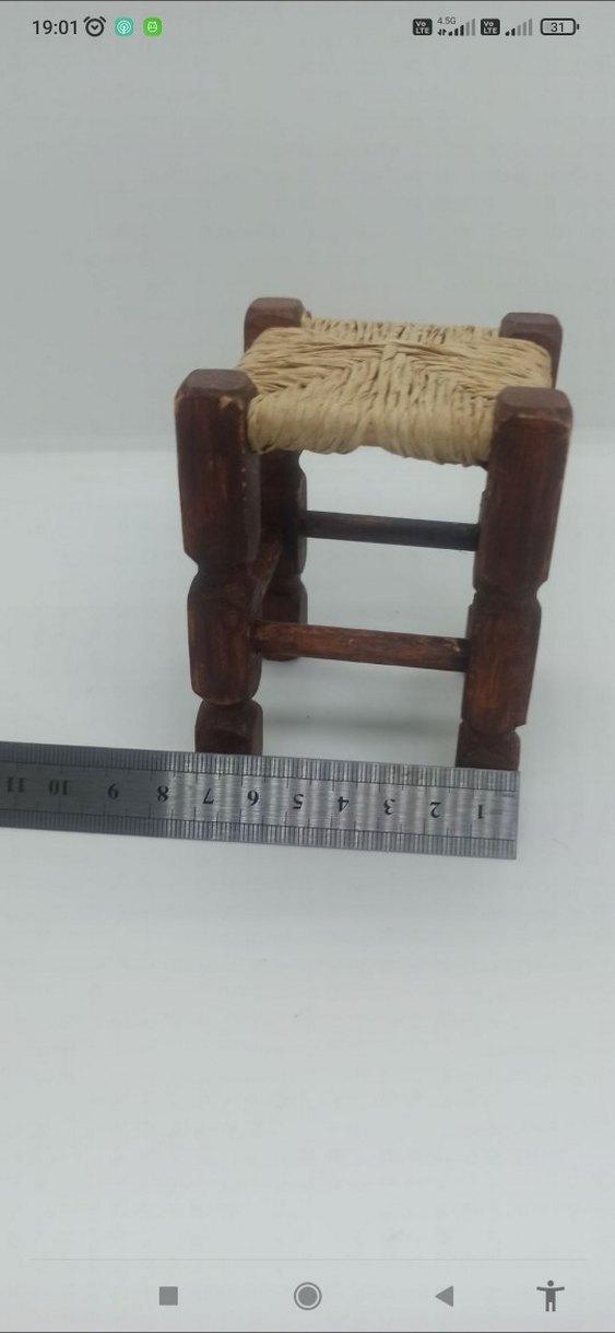 Bej renkli dokuma oturağı ve gri tonlarında ahşap ayakları olan küçük bir oyuncak tabure. Yaklaşık 9 cm yüksekliğindedir.