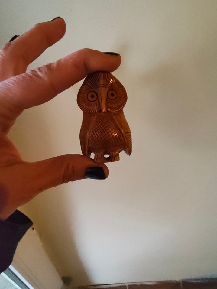 Kahverengi, ahşap oyma desenlere sahip küçük baykuş tütsülük.