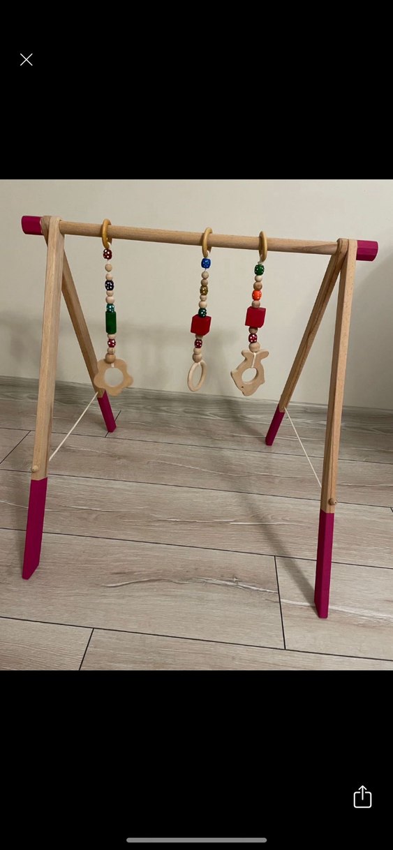 Hafif ahşap çerçeveli, boncuk ve şekillerle süslenmiş renkli oyuncaklar içeren bebek jimnastiği. Bebekler için eğlenceli oyun sağlar.