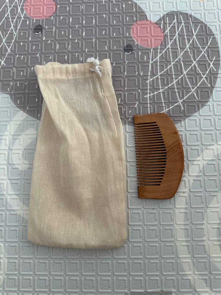 İnce dişli ahşap tarak, kolay saklama için yumuşak bez kılıf ile birlikte gelir. Kompakt ve doğal malzeme tasarımı.