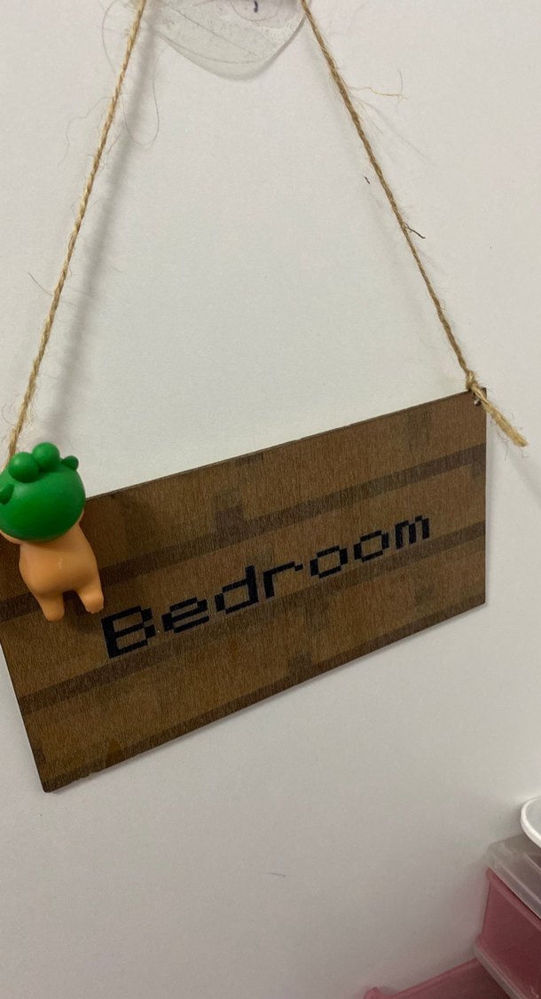 Kahverengi ahşap üzerine "Bedroom" yazılı, doğal ip ile asılan küçük yeşil figürlü (çıkıyor) kapı tabelası. minecrafttan esinlenmis