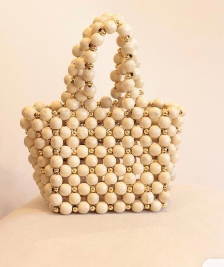Beyaz renkte, ahşap boncuklarla tasarlanmış bohem tarzda minimalist kadın çantası, günlük kullanıma uygundur.