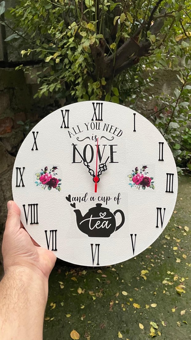 Boyut : Çapı 32cm Kendi ürünlerimiz El Boyaması Roma rakamlı beyaz duvar saati, çiçek desenleri ve "All you need is LOVE" ile "and a cup of tea" yazıları bulunur. Siyah akrep ve yelkovan, kırmızı saniye kolu vardır. ️