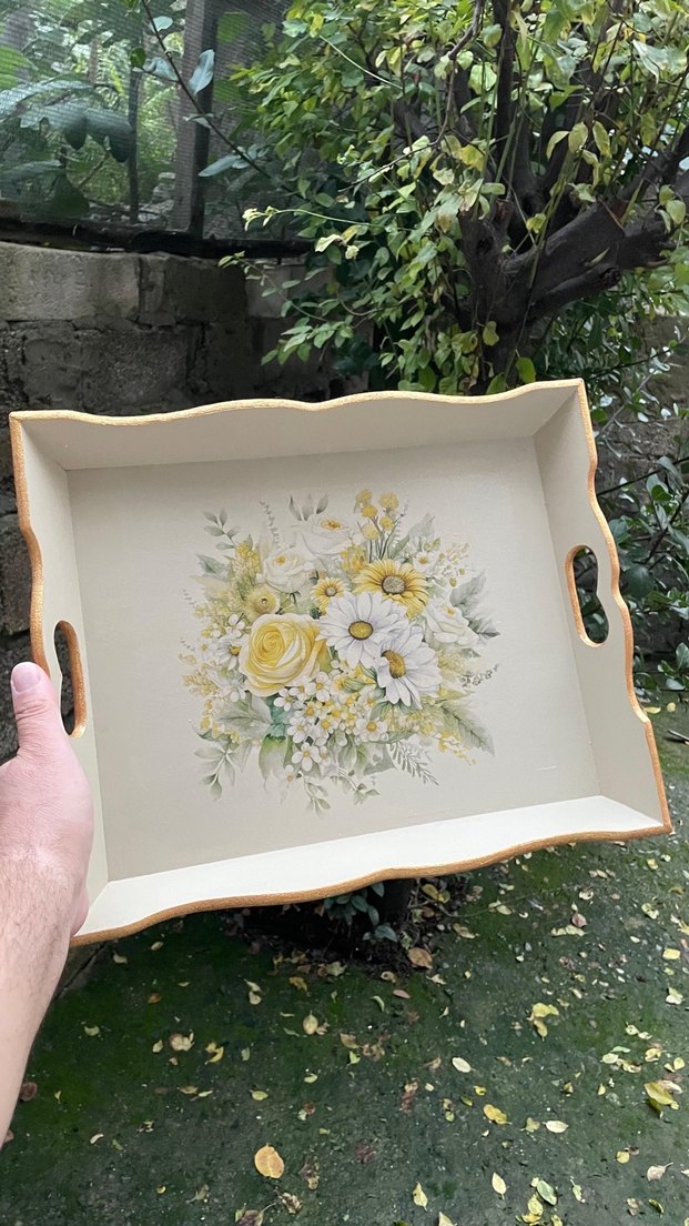 Ahşap Boyama Çiçek Desenli Dekoratif Sunum Tepsisi