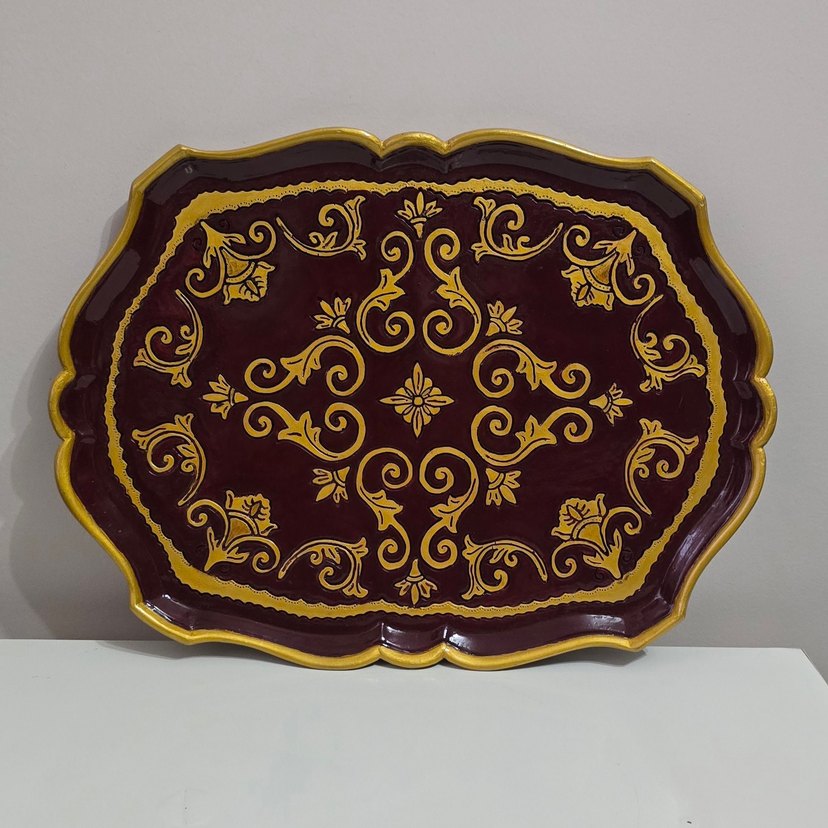Bordo renginde, el emeği göz nuru klasik desenlere sahip ahşap dekoratif tepsi. ️45cm × 33cm