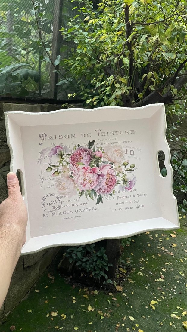 Boyut : 40 X 32.5 Pastel pembe renkli, çiçek desenli ve Fransızca vintage yazılı sunum tepsisi.