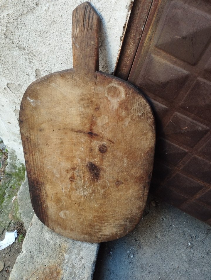 Saplı büyük ahşap hamur tahtası, doğal ahşap dokusu ve kullanım izleriyle.et kesme ekmek tahtası seksen yıllık antika restoranda dekor amaçlı kullanılmıştır