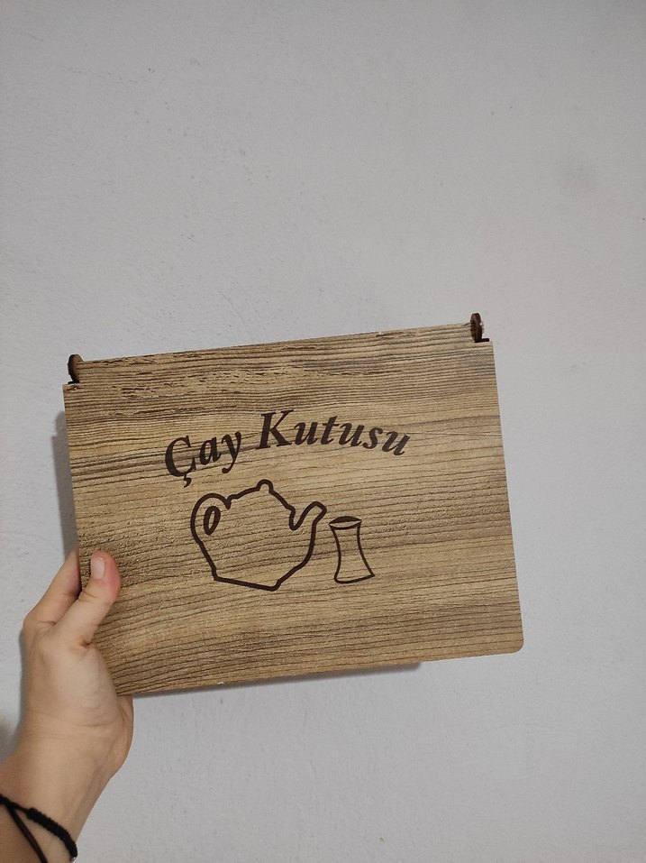 "Çay Kutusu" yazılı, demlik ve bardak figürlü ahşap çay kutusu. Çay malzemeleri için saklama kutusu. Hiç kullanmadım çeyiz fazlalığıdır. vanilin kabartma tozu vs de koyulabilir.