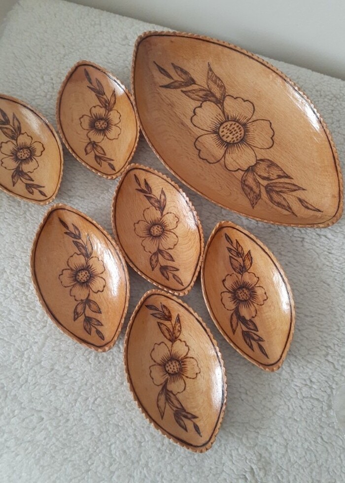 El işi yakma tekniğiyle hazırlanmış 7 parça ahşap çerezlik. Ürün sıfır olup hiç kullanılmamıştır.