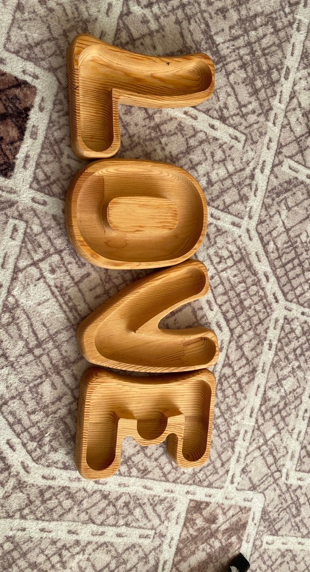 Doğal ahşap dokusuna sahip L, O, V, E harflerinden oluşan kahverengi ahşap çerezlik dekorasyon için uygundur.