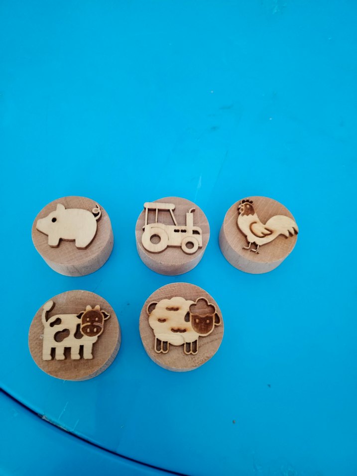 çiftlik hayvanları ve traktör figürlü ahşap damgalar, eğlenceli hamur oyunlarıiçin uygundur.