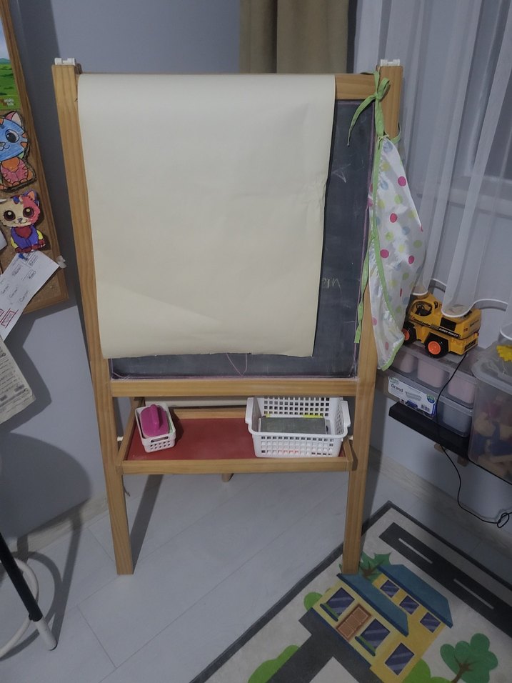 Ahşap çocuk rafı, beyaz kağıt rulosu ve tebeşir tahtası yüzeyi ve beyaz tahta yüzeyi ayri ayridir. ️ kagit rulosu takilabilir. ikea markadir.