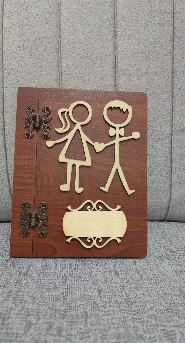 Parlak kahverengi ahşaptan yapılmış, el ele tutuşan çöp adam figürleri ve süslü menteşeleri olan defter