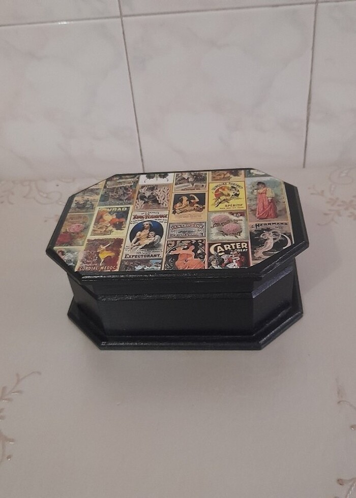 Ahşap kutu.Kendimiz boyamistik.Kutunun altında nokta nokta çok bariz olmayan boya aşinmasi olmuş.Istenirse yeniden boyanabilir.Resimlerde mevcut