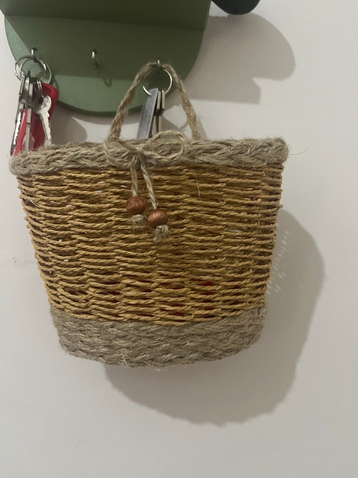 Ahşap boncuk detaylı, dayanıklı saplara sahip açık kahverengi örgü sepet. El yapımıdır