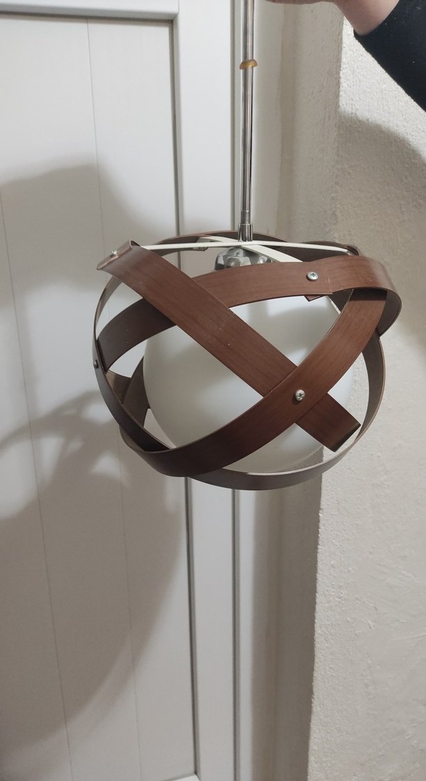 Ahşap bantların küresel bir tasarım oluşturduğu, metal çubukla asılan modern ve doğal görünümlü sarkıt lamba.