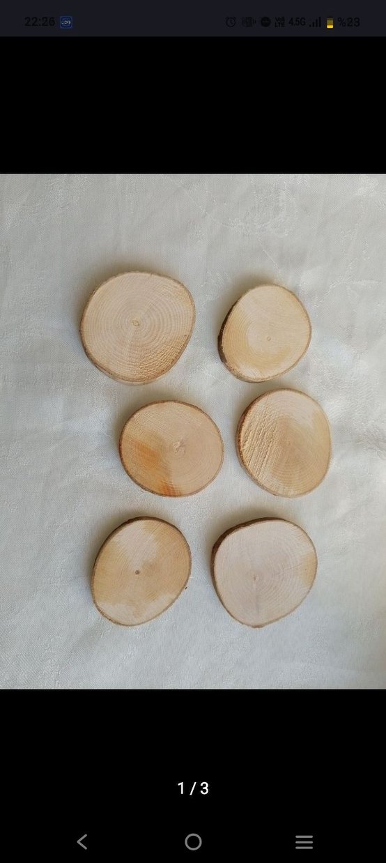 Doğal dokulu, açık bej renkte ahşap dilimler. Yaratıcı oyun ve dekorasyon için uygundur.