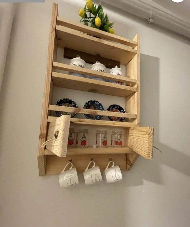 Çok katmanlı, iki küçük kapaklı ve fincan asmak için kancalı açık renkli ahşap duvar rafı. Mutfak eşyaları için düzenli depolama sağlar.