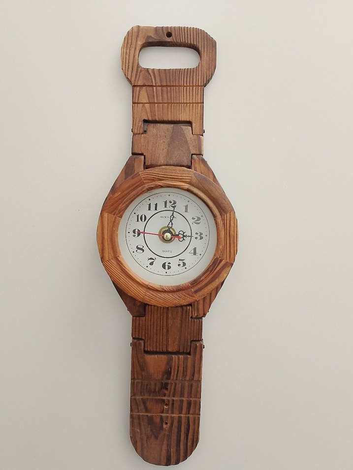 Bilek saati şeklinde tasarlanmış, renkli kadranlı ve okunaklı rakamlı bej ahşap duvar saati. ⏰