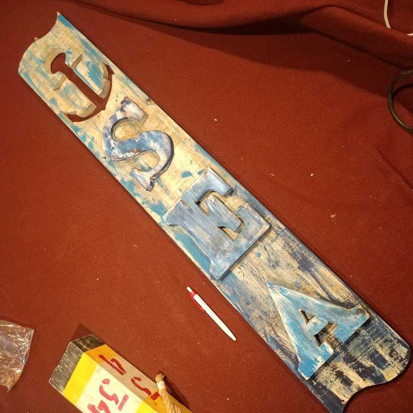 Soluk mavi ve beyaz boya ile eski ahşap sanat panosu, yıpranmış harf ve sayılar içerir. Rustik ve sanatsal görünümlü. 94*17 cm ölçülerinde.