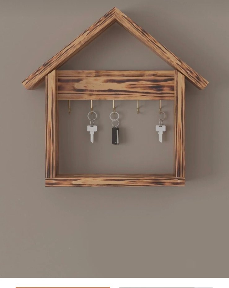 Ev şeklinde tasarlanmış ahşap anahtarlık, anahtarlarınızı düzenlemek için birden fazla askı içerir ve rustik bir görünüm sunar.