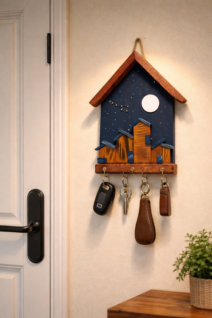Ahşap ev şekilli anahtarlık, koyu mavi zemin ve anahtarlar için küçük kancalarla işlevselliği dekoratif şıklıkla birleştirir.