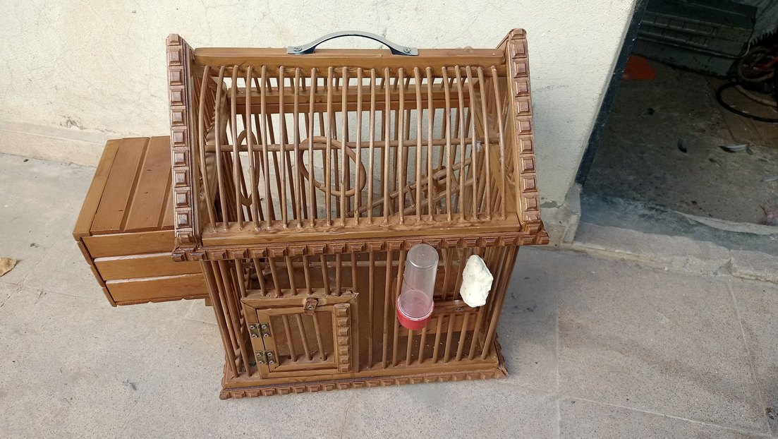 Ahşap küçük evcil hayvan kafesi, üstte sap, ön kapıda menteşe, yan tarafta su ve yem kabı ile donatılmıştır. Özel yapım Ahşap Kuş Kafesi.İçinde merdevini yem kutusu suluğu salıncağı yuvası gaga taşı herşeyi mevcuttur.Hiç bir kırık çatlak yoktur.500 gram yuva kumu hediyedir.