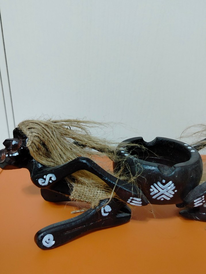 Beyaz desenlerle süslenmiş, doğal lif detaylı ahşap dekoratif figürin.