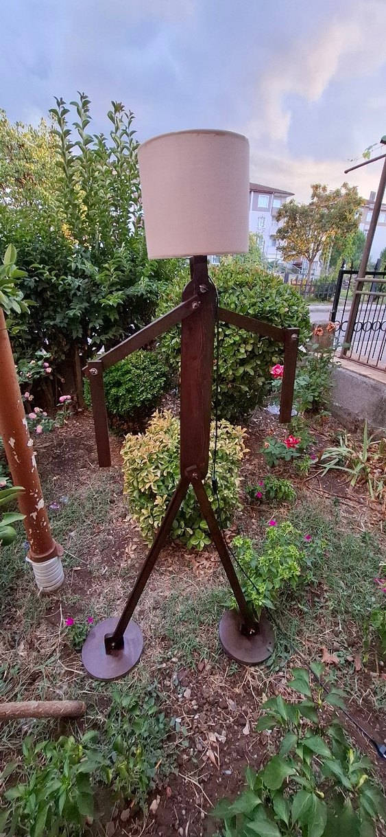 Koyu kahverengi ayaklı, ahşap figür tasarımlı, silindirik kumaş abajurlu lamba. Sıcak ortam ışığı sağlar. demonte halde gönderilir.