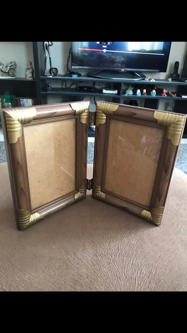 Parlak bej renkli, dekoratif altın köşe detaylarına sahip çift ahşap fotoğraf çerçevesi, yan yana iki fotoğraf için uygundur. ️