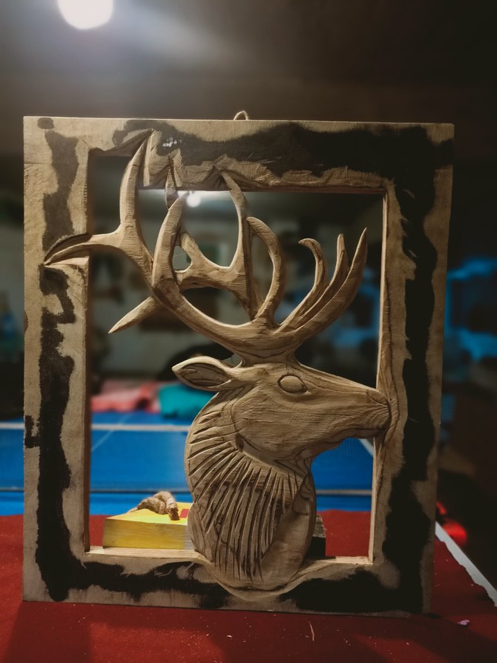Koyu kahverengi ahşap çerçeve içinde oyma geyik figürü, ayrıntılı boynuz ve tüy dokusu ile rustik bir dekoratif ürün.60*53 cm ölçülerinde .