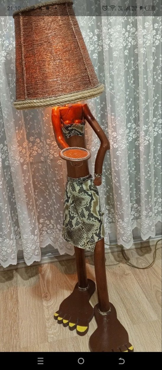 Ahşap gövdeli, açık kahverengi abajurlu ve dekoratif kumaş detaylı lambader. Sıcak ve doğal bir aydınlatma sağlar.Ölçü resimler de vardır.El yapımıdır.