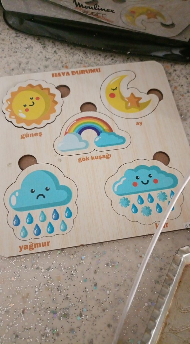 Ahşap eğitici oyuncakta güneş, ay, gökkuşağı ve yağmur bulutları bulunur, renkli ve sevimli figürlerle tasarlanmıştır.