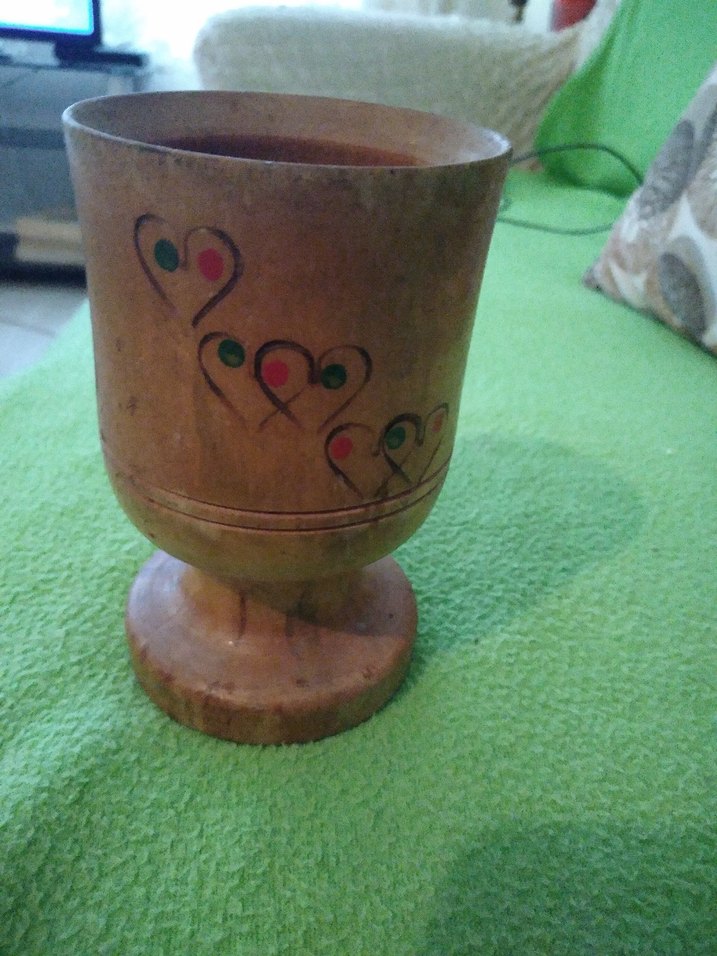 Ahşap malzemeden yapılmış, renkli kalp desenlerine sahip kahverengi vazo. Yuvarlak sağlam bir tabana sahiptir. havan eli catlamis baska bir tane gonderilebilir