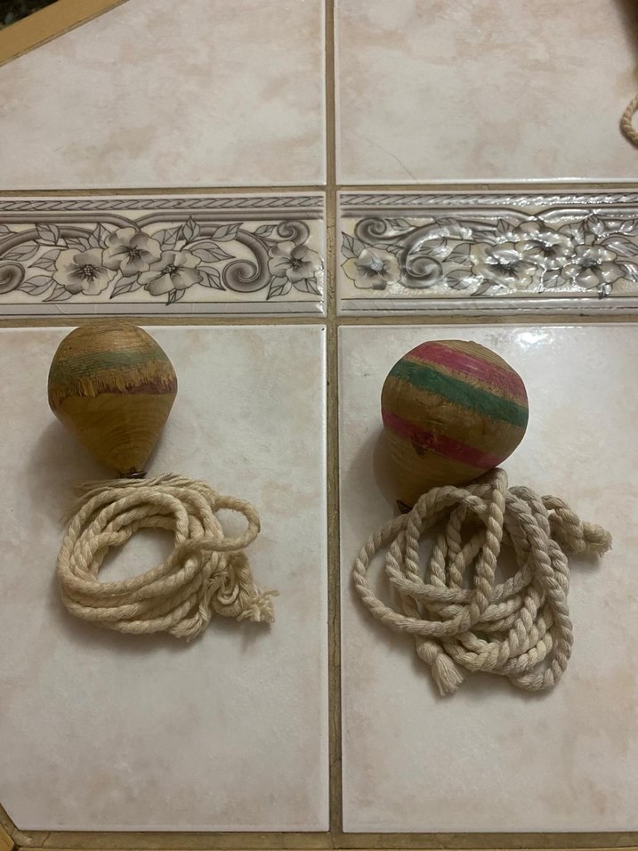 İki adet geleneksel ahşap ip oyuncakları, renkli çizgilerle boyanmış ve kalın pamuk iplerle birlikte. El yapımı ve klasik tarzda oyuncaklar. iki adettir tane fiyat