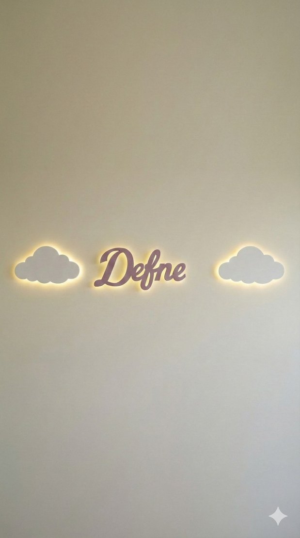 8mm mdf den ışıklı duvar/Kapı dekoru.İsim ebat 35cm olmakla birlikte tamamen el boyaması üzerine saten vernik uygulaması yapılmaktadır. Nemli bezle temizleyebilirsiniz.İstenilen renk çalışılır. 1 isim 2 bulut set fiyatıdır.2 isimde fiyat farkı +250TL eklenir.Sipariş vermeden önce lütfen yazın, isteğe göre yeni ilan açılacaktır. Sipariş yoğunluğuna göre kargoya verilme süresi 3-7 iş günüdür.