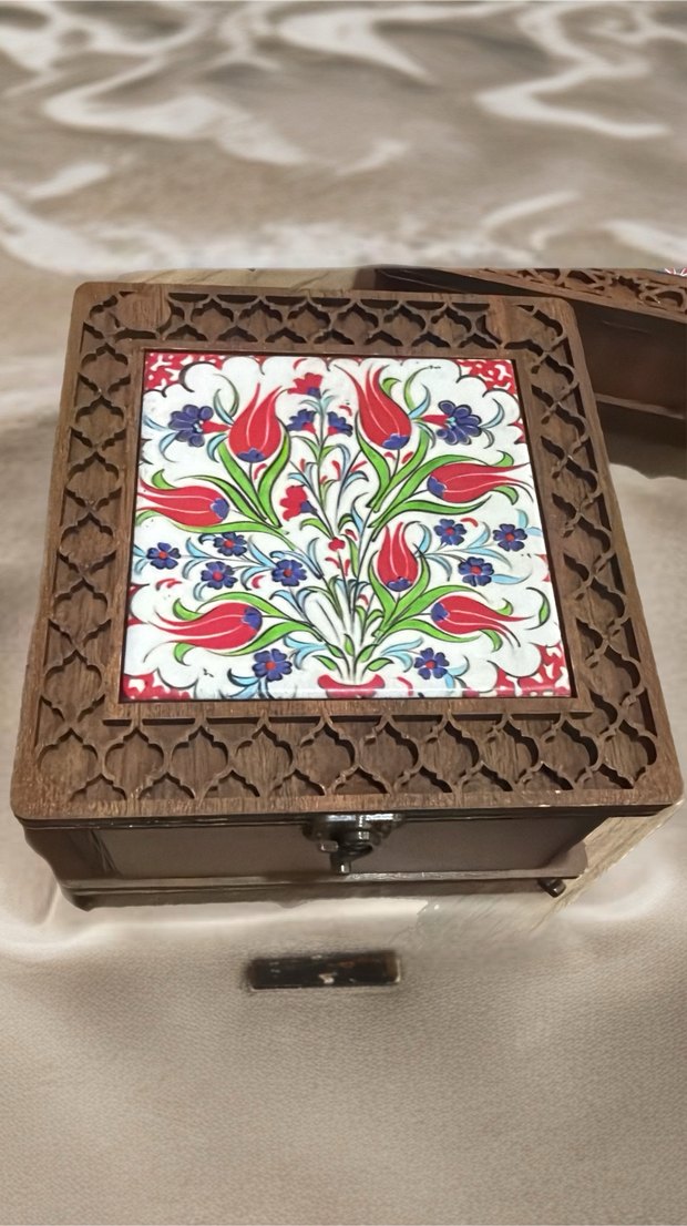 El işçiliğiyle yapılmış ahşap kutu, çini kapakta geleneksel çiçek desenleri bulunur. Küçük eşyalar için uygundur. 10 x 10 - 7.5 x15 - 5 x 10 ebatlarında ahşap kutular