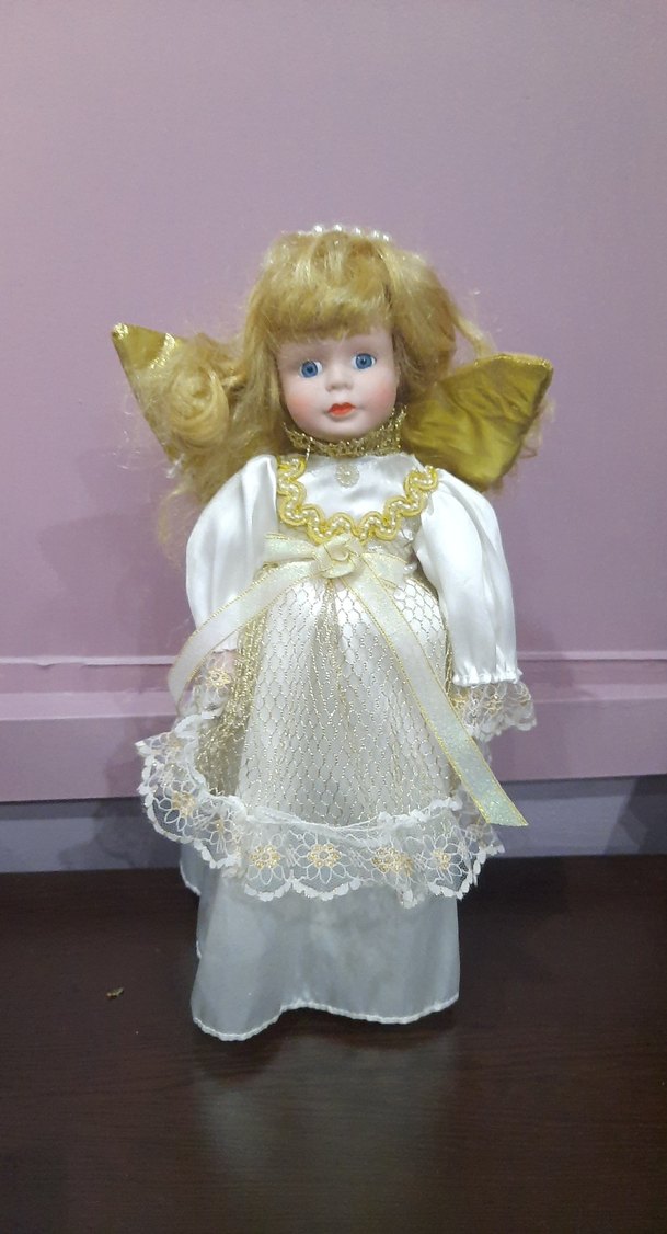 Altın kanatlar ve dantel detaylı beyaz elbise giymiş, sarı saçlı ve mavi gözlü melek bebek. Belinde ince bir kurdele bulunur.