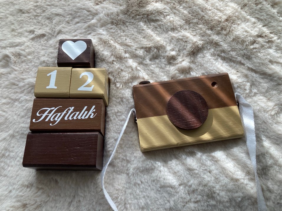Yuvarlak lensli kahverengi ahşap oyuncak kamera ve üzerinde kalp, 2 sayısı ile "taltk" yazan bloklar seti.