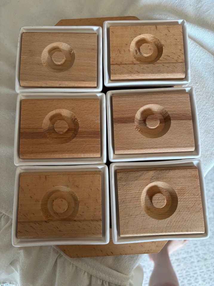 Ahşap kapaklı, bej renk saklama kaplarından oluşan set. Mutfakta çeşitli malzemeleri düzenlemek için uygun. Kapaklarda kolay açma için dairesel kulp bulunur. Kahvaltı takımı dıye almıştım Cerezlık Recellık olur Tepsılı Hıc kullanmadım ahşabın dokusundan anlaşılır Evımde yer olmadığı ıcın dolabımı boşaltıyorum Ahşabın kendı yapısından kaynaklı pütürlukler var görsele ekledım Aldığımda da öyleydi ahşap dokusu kaynaklı