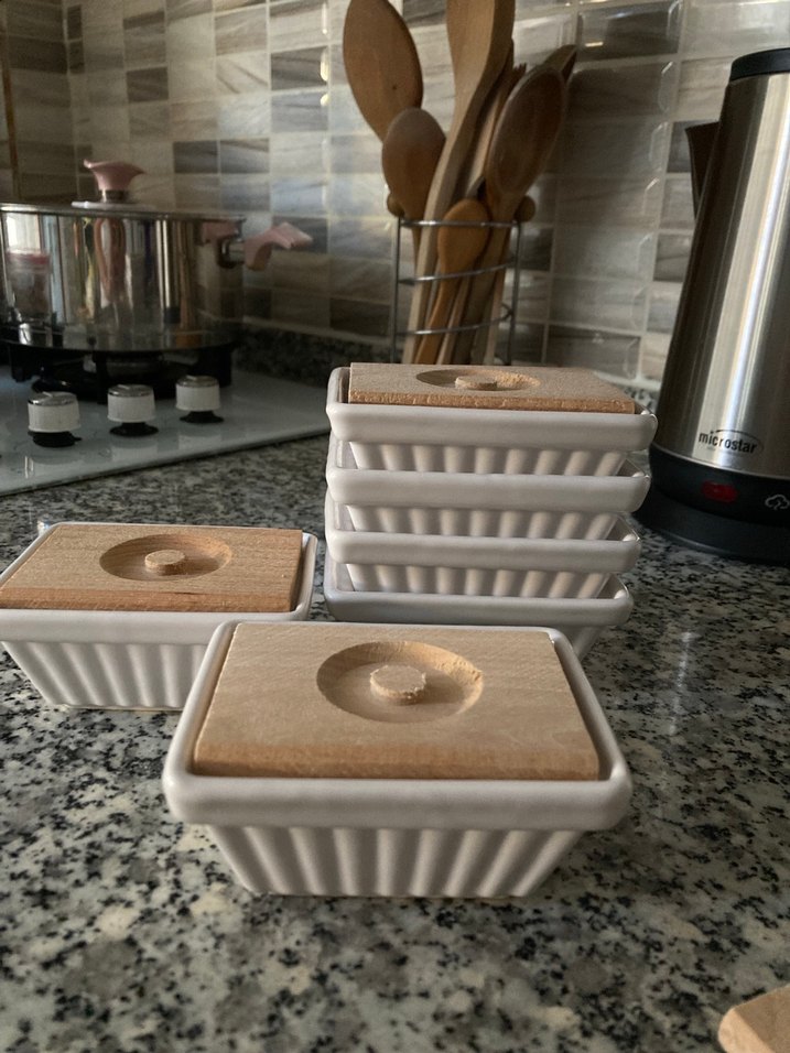 Ahşap kapaklı, kabartmalı beyaz saklama kapları seti. Mutfakta düzen sağlamak için kullanışlıdır. Tam settir kırıgı yok