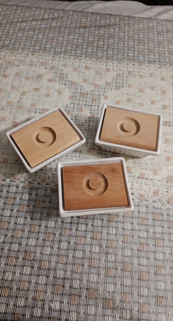 Ahşap kapaklı, beyaz renkli saklama kapları. Üzerinde dairesel tutma yeri bulunan doğal ve şık tasarım.Hiç bir kırığı catlağı yoktur.