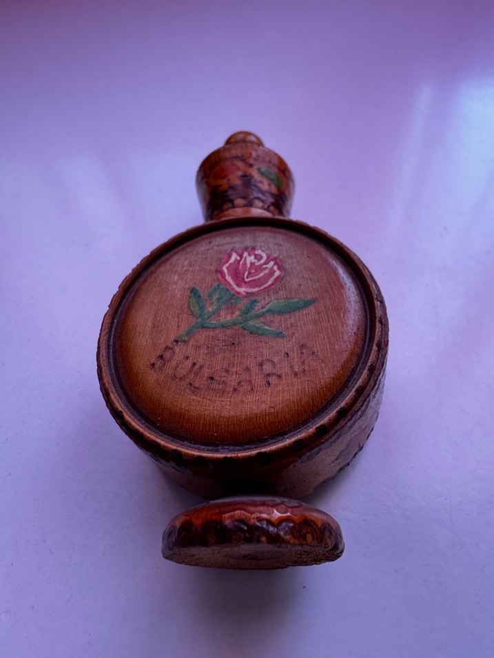 Bulgaristan yapımı, gül desenli ahşap kapaklı kadın esans kutusu. Şişesi doğal ahşap renkli ve oyma detaylıdır.