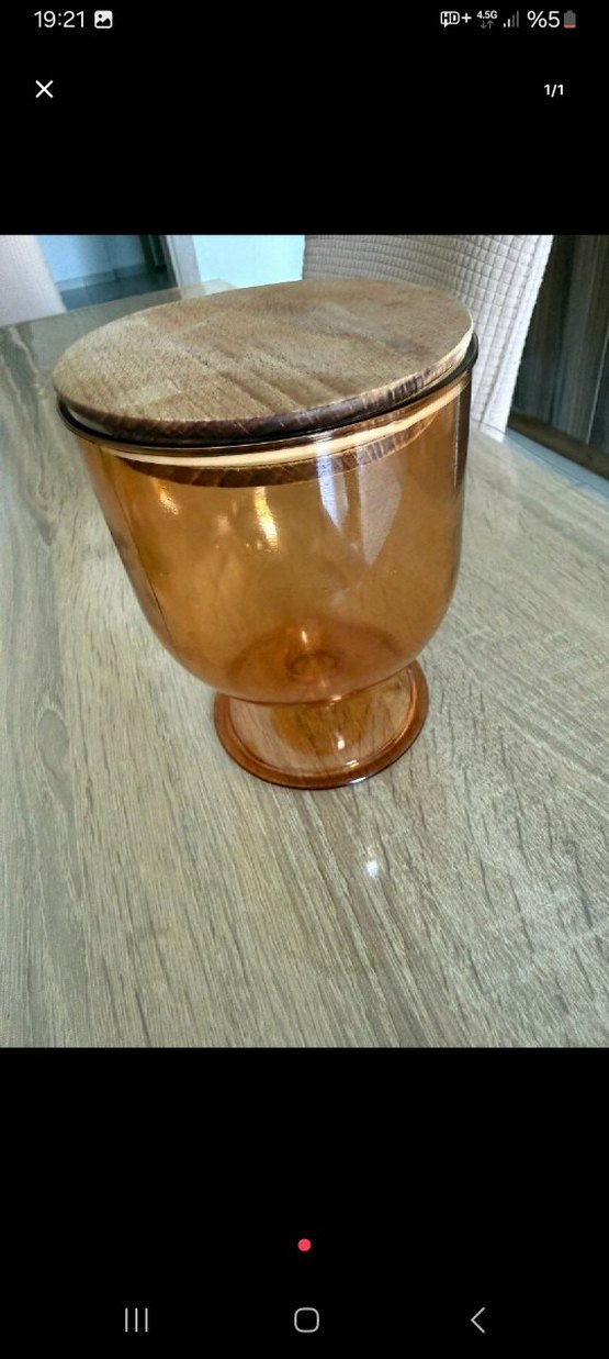 Parlak bej renkli bu vazo, ahşap kapak ve küçük bir ayaklı tabana sahiptir. Mekâna zarafet katar.