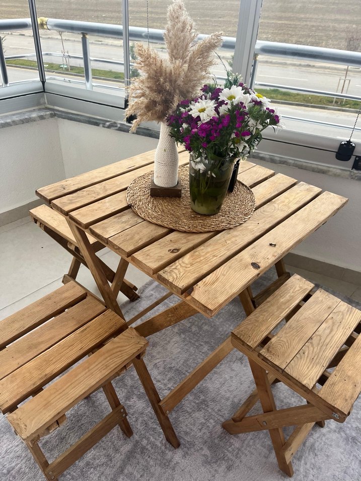 Bej pastel tonlarında doğal dokulu ahşap katlanabilir masa ve sandalyeler, pencere kenarında açık renk halı üzerinde yer alıyor.