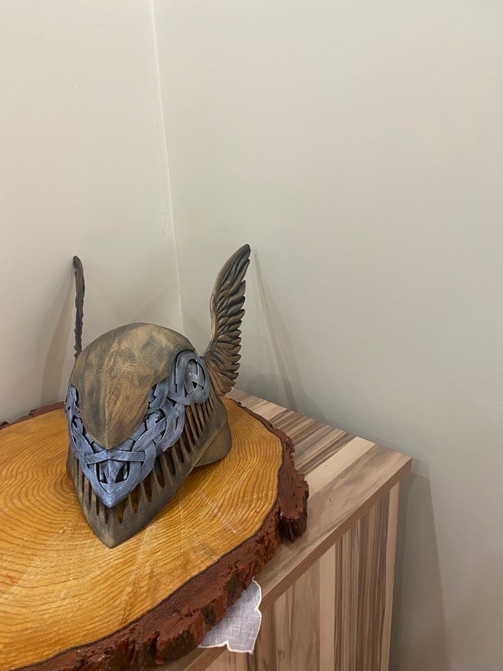 Kemerli, ahşap malzemeden yapılmış koyu gri motosiklet kaskı. Kanat detayları ve sade tasarımıyla avant-garde ve rock punk havası taşıyor. ️