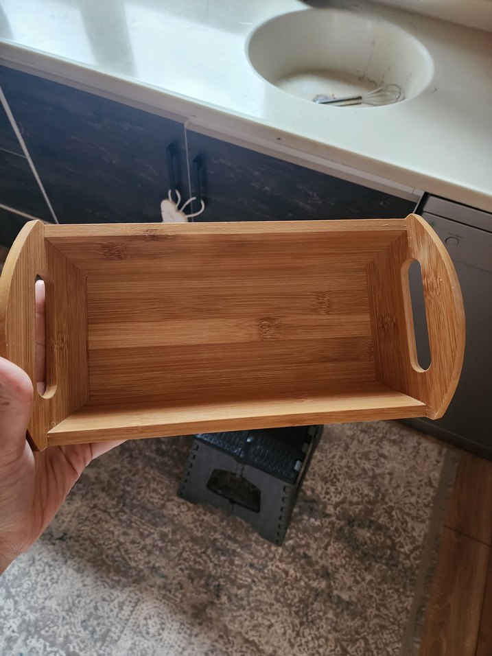 Bej renkte, yanlarında tutma kulpları bulunan ahşap kesme gereçleri tutucu. Mutfakta düzen sağlamak için ideal kompakt tasarım.