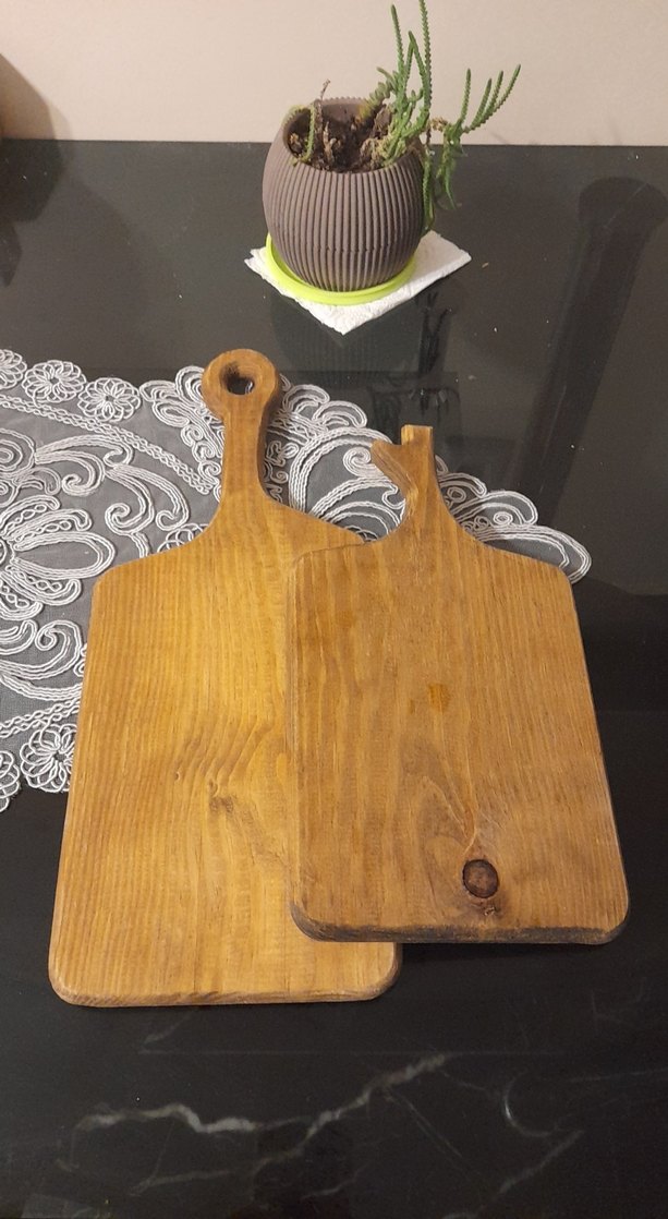 Koyu kahverengi, doğal ahşap dokulu saplı iki kesme ve sunum tahtası seti. Mutfakta kullanıma uygundur.